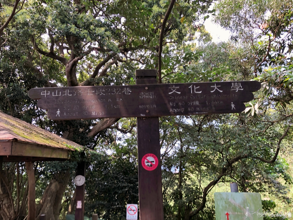▼約走30分鐘會到達一個歇息平台(旁邊還有看似別墅的住家),看著指標寫著,還可以爬到文化大學呢….