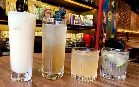 COSMO Angel共會介紹4款在家可製作的DIY調酒與一款經典的柯夢波丹調酒,由左至右分別為:「蕉個男友」、「甜的嗨波」、「柚是你」與「莓在害羞的」。