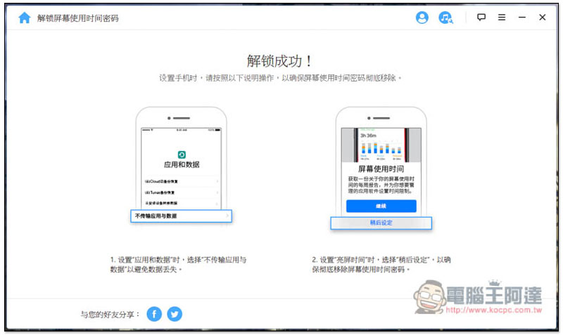 LockWiper 解鎖成功的畫面也會提示你要選這一個,螢幕使用時間也選擇 “稍後設定“: