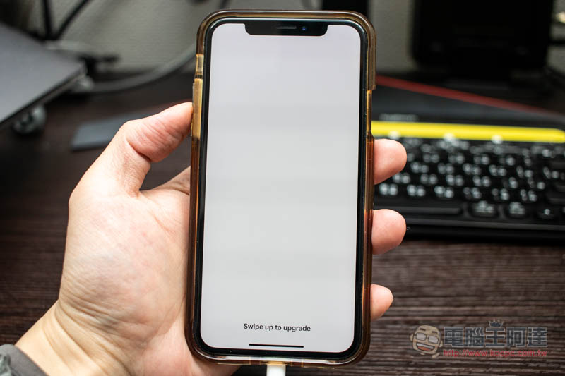 過程中,iPhone 會顯示這個全白畫面,這時請由底部往上滑動: