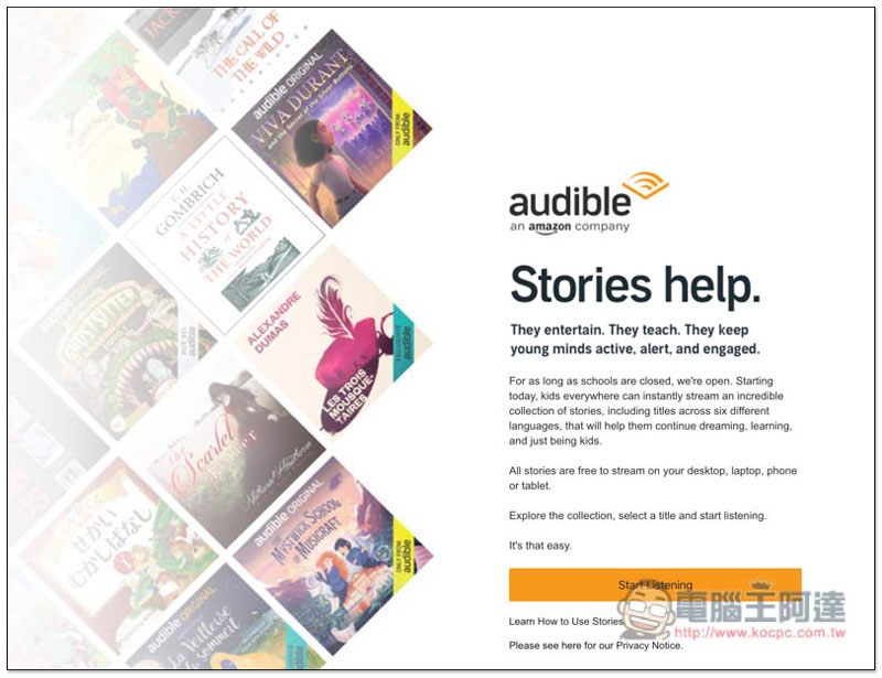 現在進入 Amazon Audible 專屬網址後,點選下方 Start Listening 即可開始聆聽。不確定這些有聲故事書會免費開放多久,但說明中有提到,只要學校關門,這服務就在: