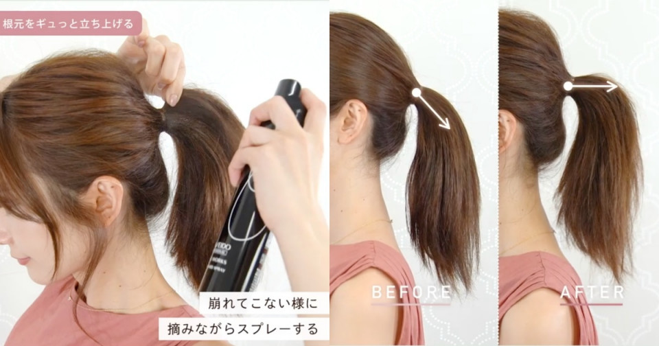 接著,我們稍微捏起小部分的上層馬尾,用定型液加強固定。可以看右下圖的前後比對,能明顯發現只要增加這個小技巧,幫馬尾增長、接骨後,髮型年輕許多~