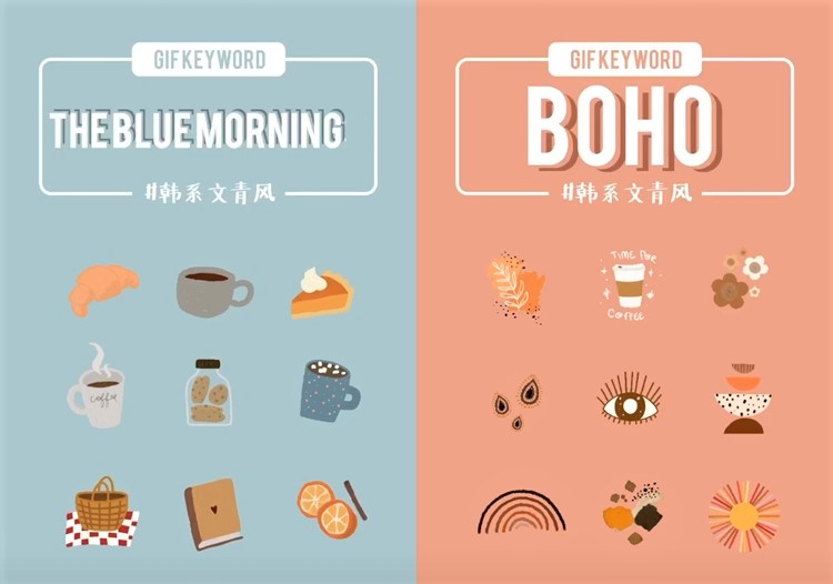 如果你是咖啡愛好者,那推薦這2組關鍵字給你。第一組是THE BLUE MORNING,這系列比較像卡通文青的風格,當然除了咖啡之外還有一些甜點麵包的貼圖,真的很貼心的關鍵字組合!再來第2組的BOHO則是以各種幾何圖形的咖啡色系貼圖為主,在選擇GIF圖時,不一定要跟照片元素一樣,只要色系一致,並選用自己喜歡的圖佈置起來也是很美的!