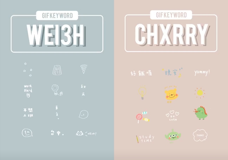 很多人會問怎麼GIF圖都是英文為主?都沒有中文的嗎?在這推薦你這組wei3h,不要問為什麼儂編每款手繪風的貼圖都推?因為真的都太可愛了啦(羞)!相信各位看到這款也絕對會納入口袋名單的!再來是chxrry這組,雖然它的中文字比較少,但它光這些彩色的卡通圖案就贏了啦!