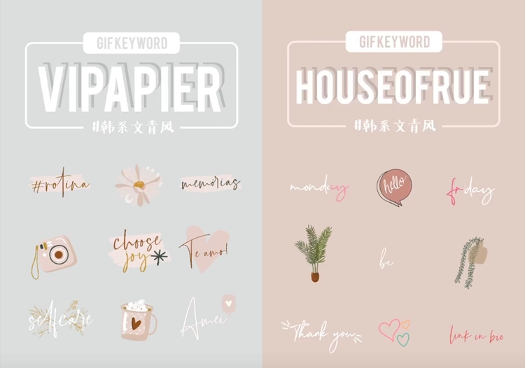 如果喜歡各種唯美文青字體的風格的話,你一定要試試這2個關鍵字,第一個是VIPAPIER,這很適合文青的少女們,各種粉色系超夢幻,只是他大部分好像不是英文餒?第二個就是HOUSEOFRUE,這個得字體貼圖雖然超美超可愛的,但它的選擇真的有點少…