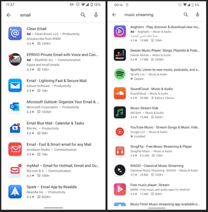 在過去,Play 商店中的搜尋結果僅顯示開發者、評分與價格,在下載應用程式時,下載量幾乎是評估一款應用程式是否受歡迎的標準,星級更是代表這款應用程式在用戶使用過後的感想。對於使用容量較小的手機時,你可能需要了解更多細節,之前你必須點入好幾層才能進一步看到該款應用程式會佔用的空間,在接下來的更新 Google 將把應用程式的佔用容量大小和下載數量也加上去。