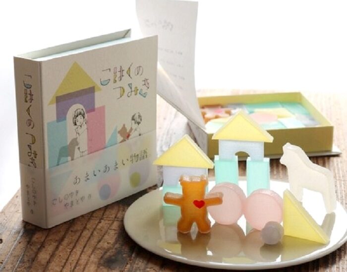 讓人引發玩心的「琥珀積木」組合根本捨不得吃啊!就像真的積木玩具一樣,有著熊、白馬和各種幾何圖案造型,製作成被稱作「可以吃的寶石」的琥珀糖,顏色透明又柔和,甜度也不若砂糖和寒天來得強烈,大人小孩都會喜愛。外盒包裝更設計為繪本形式,營造開箱的期待感和興奮感,饒富趣味的安排令人忍不住豎起大拇指。