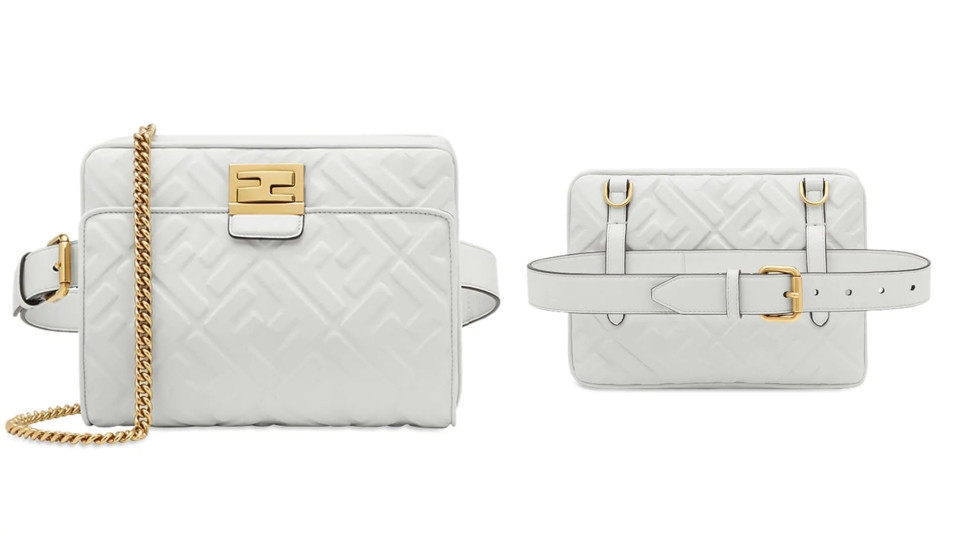 包面上有FF的壓印,一眼就能認出是fendi的包款!灰白色的包面搭配金色的扣環和鏈袋,讓包款更加高雅精緻,下班後要去參加聚餐,帶上這顆準沒錯!除此以外,還能夠變成腰包的背法,可以搭配牛仔褲或是當作長洋裝的腰身,背法多樣性,CP值很高!