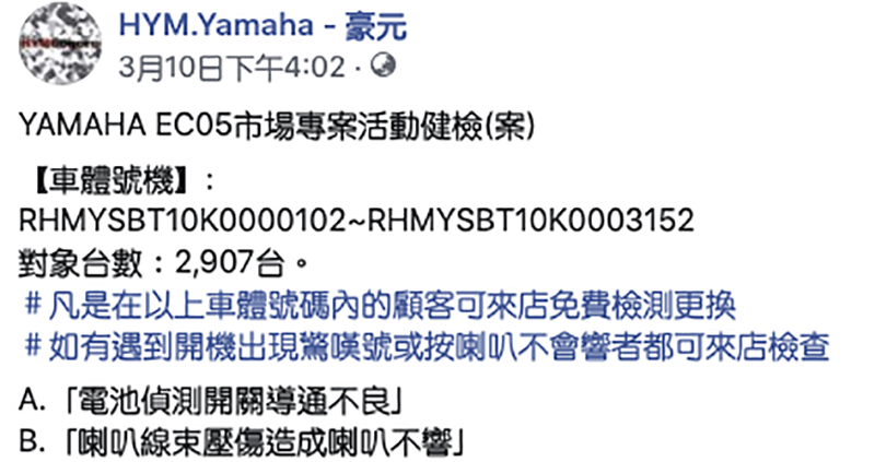 看來這次的召回更換的零件部分,影響範圍應該也包含 PBGN 車款。YAMAHA 就推出了針對特定範圍(RHMYSBT10K0000102~RHMYSBT10K0003152)共 2,907台的 EC-05,提供涵蓋範圍包含「電池偵測開關」與「喇叭線束」的健檢專案。有在影響範圍內的車主也可以前往 YAMAHA 進行檢測。至於剛好晚於本次 Gogoro 2 系列召回生產期間開賣的宏佳騰與 PGO,目前則是沒有官方的訊息。