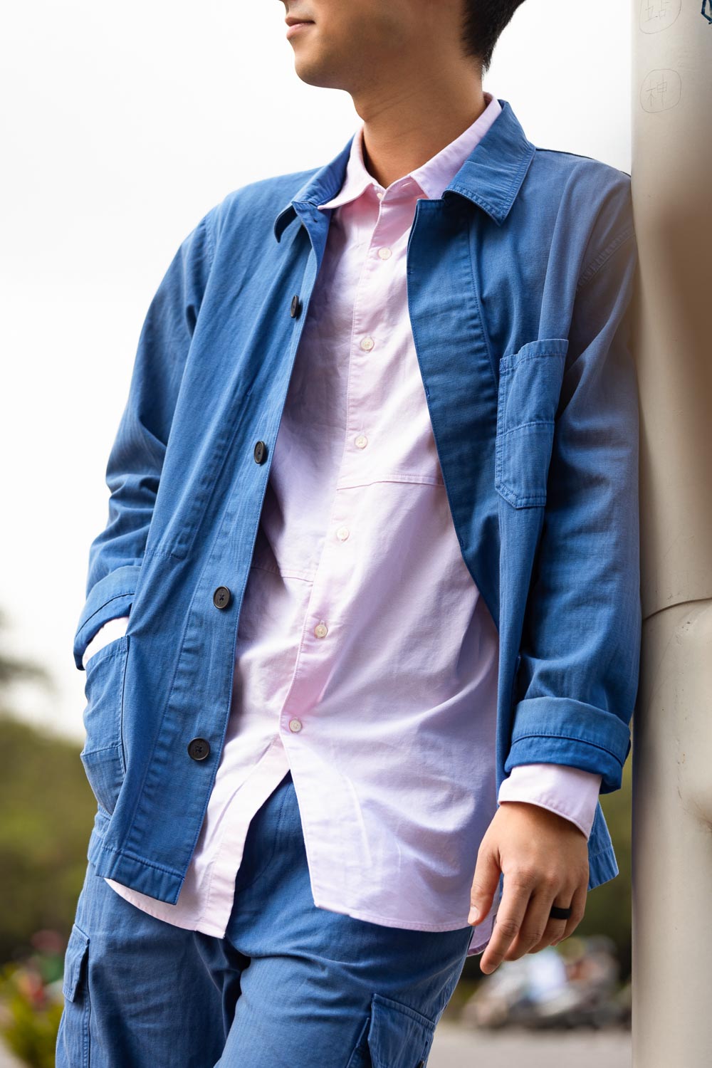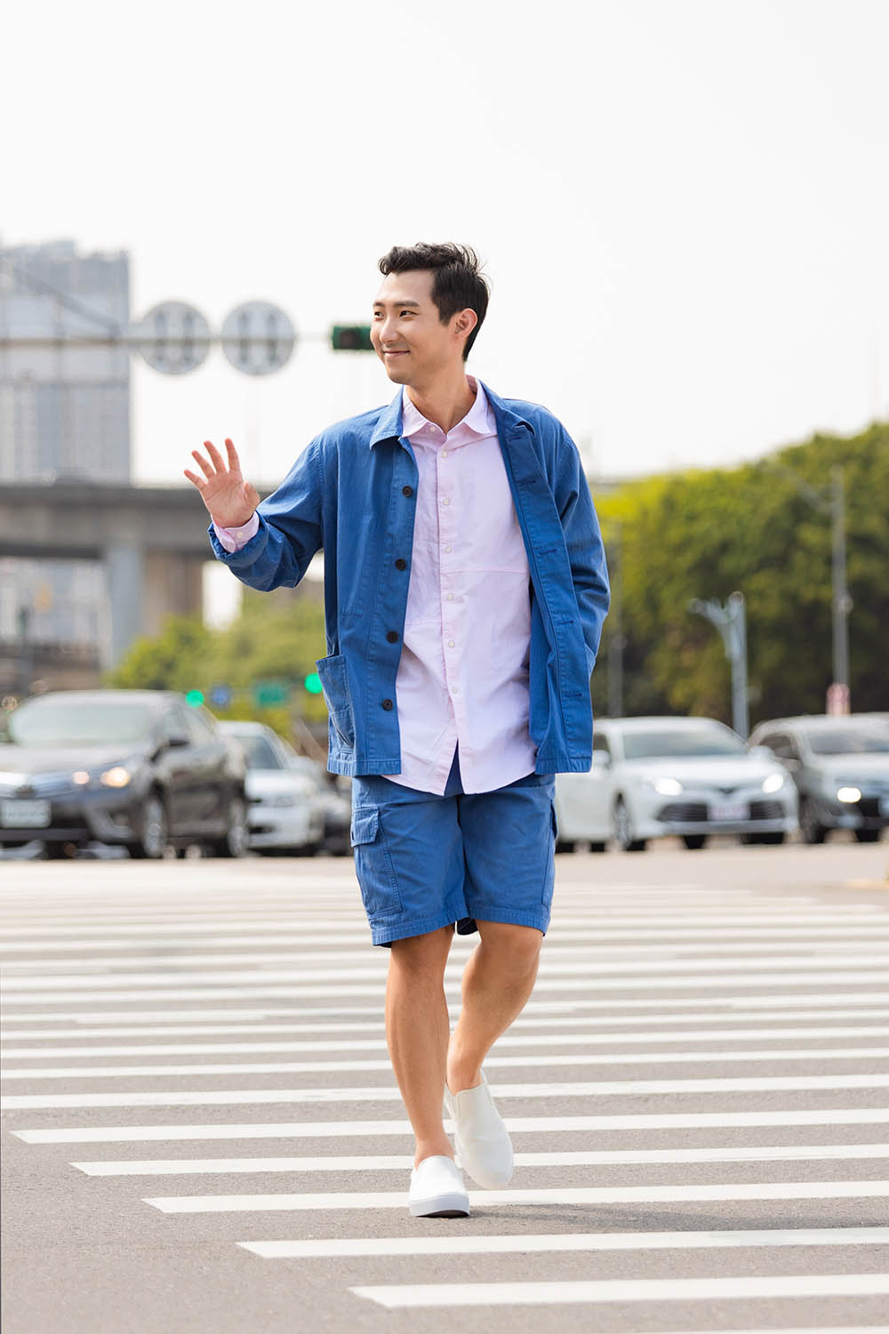 當你朝著「活在當下」前進,這夢想不是空想,其實是固態的,要能夠把夢想化為金子,即使經過現實磨蝕,夢想的含金量還是夠純、夠硬。就像形容自己為「時尚白癡」,穿搭完全靠老婆的劉沛,當天私服是安全的一身黑。當我們讓他換上 UNQLO and JW ANDERSON 的藍色水洗棉質工作外套、短褲,搭配粉紅色襯衫,他是舒服且自信的,還在自己 IG po 限動 :「醬可以當 model 嗎?」