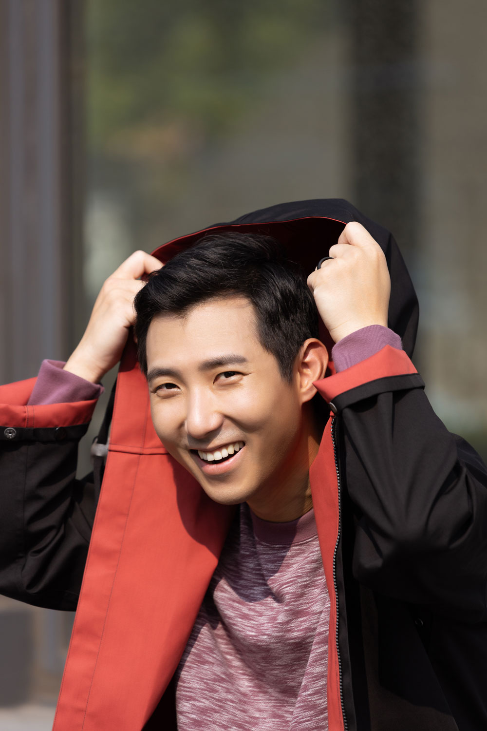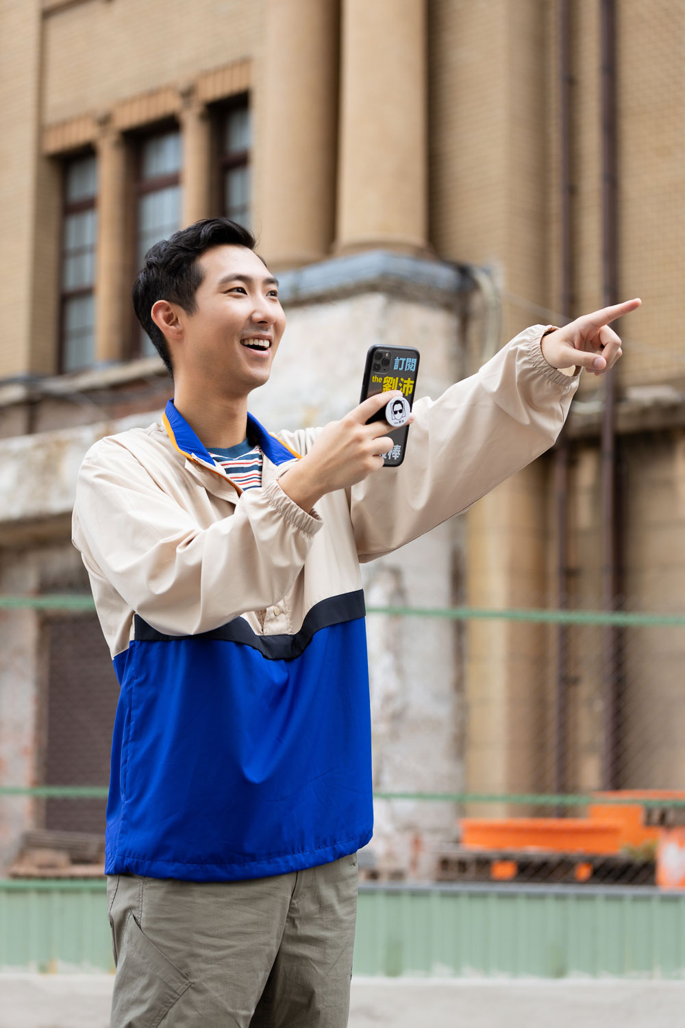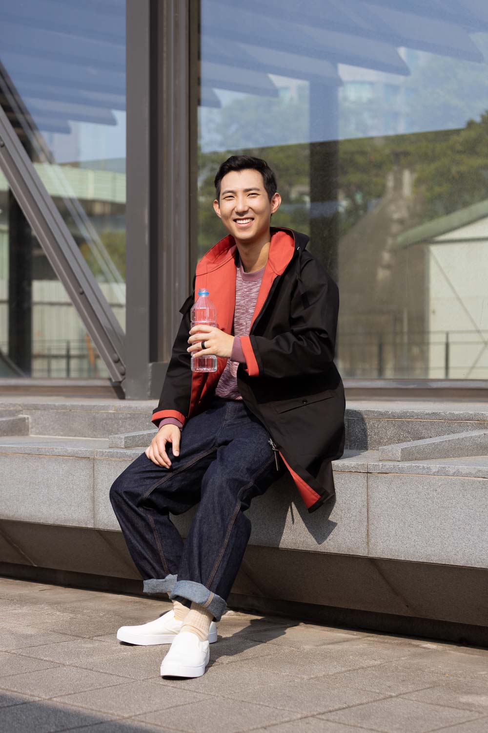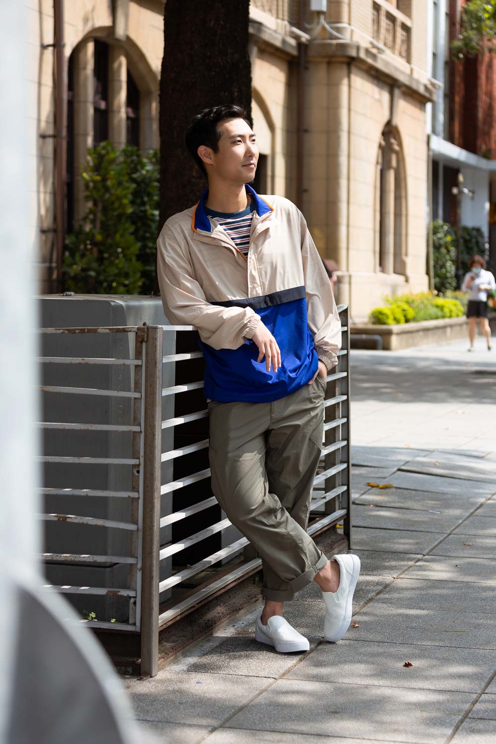 叨唸著自己不會擺pose,但當他打開 Pokemon GO ,「欸,有新寶貝耶,在 228 紀念公園,」專注於當下抓寶,穿著撞色布勞森外套、ACTIVE 長褲,內搭的條紋T-shirt讓整體視覺更有層次感,鏡頭裡的劉沛不用刻意做表情、pose,顯得自信。只不過拍照當天真的太熱,當攝影喊出:「 OK 」,劉沛立刻脫掉外套,「可以折疊收進附的收納袋,又小又輕,很方便。」