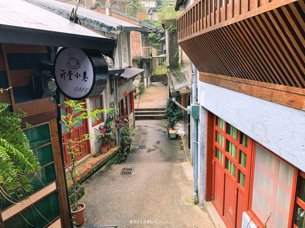 我們是將車子停在看到老礦工的店招牌附近的小小停車場,約可以停3台車,走上去就是彩虹階梯長度約20~30公尺,另一頭往下走是往原本我們預計要去的餐廳在阿婆雜貨店對面祈堂小巷咖啡館 迷迷路食堂(建議可以去看一頁之葉的文章),很可惜當天居然沒開,沒有電話沒有預約,因此我們就晃一下肚子太餓了就趕緊往瑞芳前往覓食,但是也不忘在這邊拍幾張照片,因為這個老街真的太美了,很意外的是以前從來不知道原來在這有這樣的一個小巷老街,非常具有古色古香,也因為這次的小旅行讓我決定要找一個時間再來祈堂老街實地造訪走走更認識這裡。