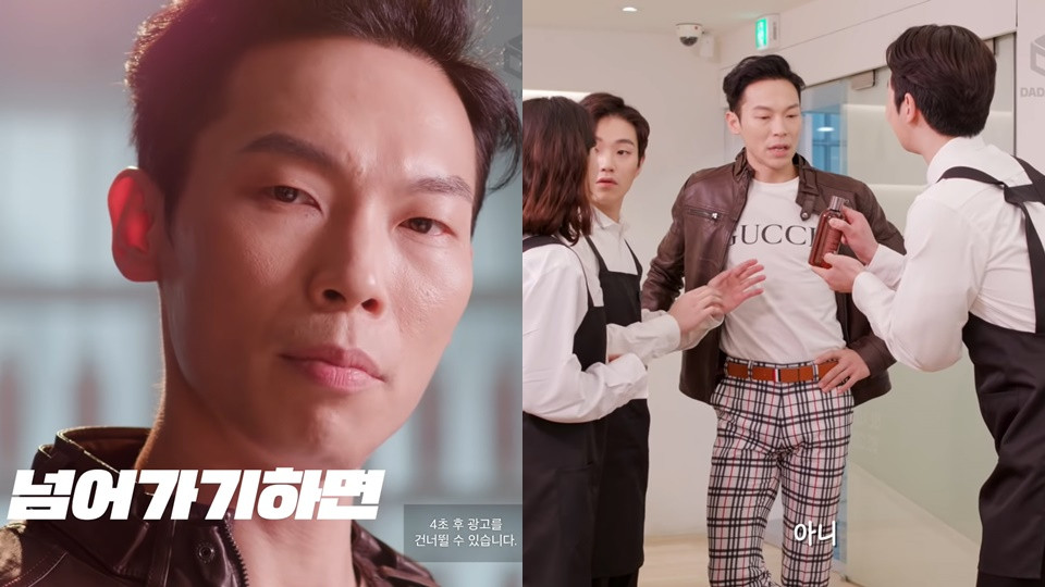 這個廣告短短兩分鐘,但笑點滿滿。像是表治秀身上穿的名牌T,其實是山寨品。看起來是「Gucci」,實際上是「Aguccim」,連店員也是山寨版玄彬。