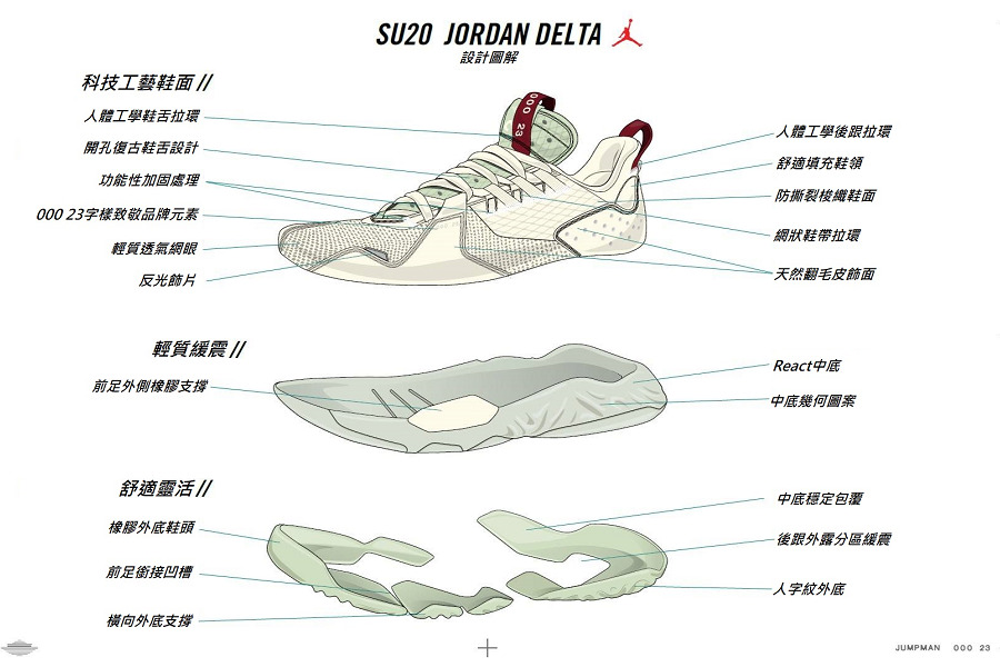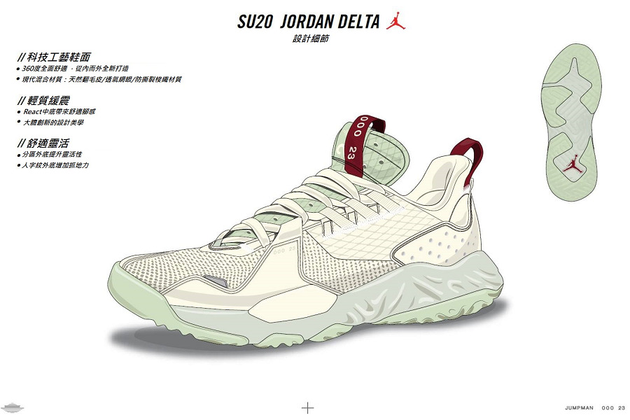 「與以往 Jordan Brand 打造的 Lifestyle 系列鞋款不太一樣,這次從最原始的設計開始著墨,包含了許多我們認為值得致敬的元素,例如:鞋底巨大的人字紋,便是向籃球運動致敬。」Jordan Brand 鞋款設計師Israel Mateo 闡述 Jordan Delta 的設計理念。鞋款致敬品牌的其他元素包括:鞋面上以細小的形式展現 Jordan Brand 特有的 000 23。另外鞋舌處泡棉外露的設計,也使這雙鞋更具有現代感。