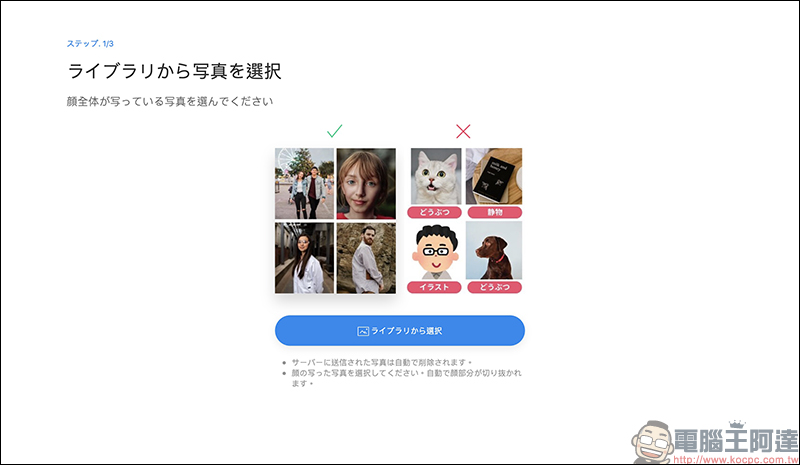 首先,選擇一張能顯示整個人臉的照片上傳,系統會偵測臉部重點進行裁切。不建議使用動物、卡通等非真實人臉的圖像,上傳到伺服器的照片將被自動刪除。