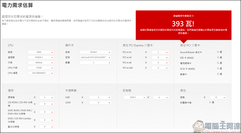 使用方式也很簡單,以筆者下個月要組的電腦來講好了,將配備資料照實的填入後,系統就會根據配備給予瓦數的建議,同時會建議拿比建議瓦數略高的電供,像我這單的配備系統就建議需要393瓦,以我的習慣來講,至少我會拿個金牌650W以上的電供,以確保供電的安全,而且組電腦時要注意,電源供應器的錢千萬不能省,好的電供真的能讓你電腦平平安安的作業,而且現在保固這麼長效,認真算下來這筆投資是很划算的!