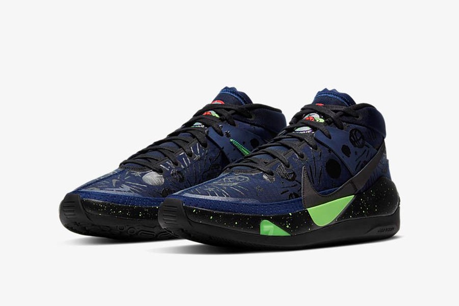 KD13 「籃球之星」配色以深藍色和黑色為基調,代表著深夜星空和月球表面,亮綠色的點綴搭配靈感則來自科幻電影;鞋面透過具有強烈塗鴉風格的手繪圖稿,呈現青少年天真不羈的個性。這雙鞋款創造出一個籃球星球,不僅鼓勵每一個熱愛籃球的人親自感受籃球文化的魅力,以無懼困難的態度為正式上場做好準備,更同時致敬 Kevin Durant 對籃球的熱情和付出。