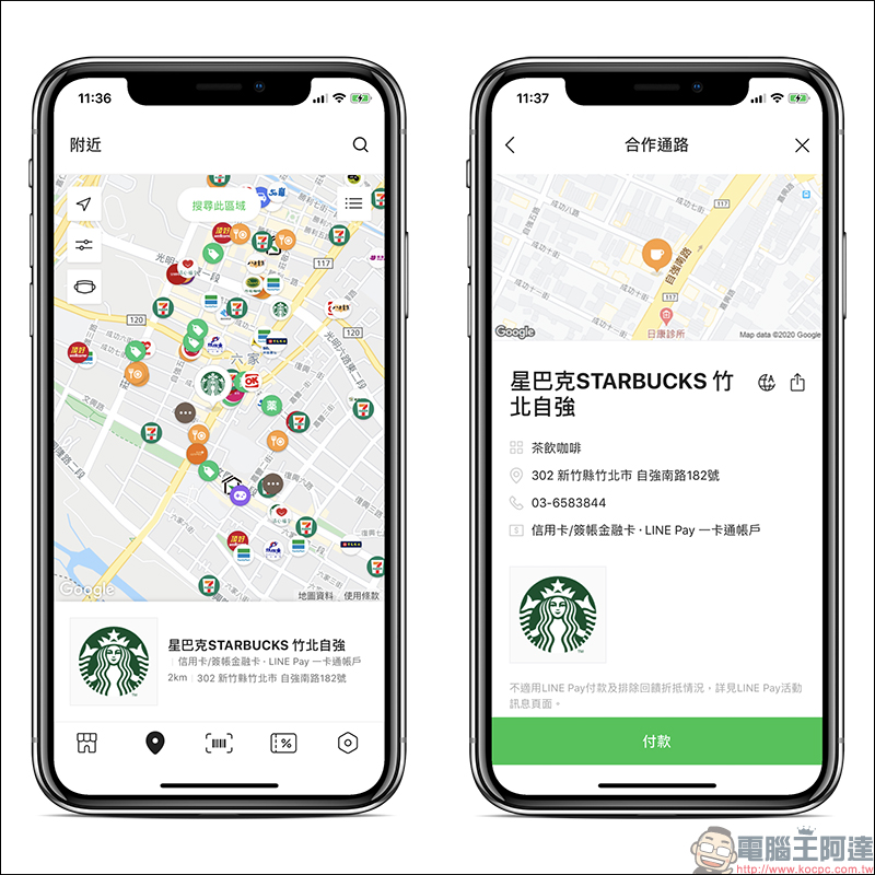 如果不熟悉公司、住家或目前附近哪裡有星巴克門市,只要打開 LINE Pay App 點選「附近」頁面進行搜尋,也能以地圖或清單形式顯示週遭的星巴克門市位置、營業資訊,點選「付款」則可直接切換至 LINE Pay 付款頁面: