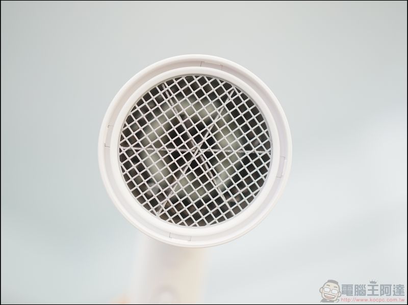 在吹風機尾部配置了金屬防塵護網,可防止異物或您的長髮吸入,由這個角度可看到內建六葉低噪音風扇與低噪音高效馬達(轉速高達每分鐘 18600轉),特殊的設計具備減低風切與噪音的效果,使用時號稱僅有 69 分貝,而且強大的 2.3M³/Min 出風能力也讓吹髮時間大幅度簡短,我家小女兒原本每次都要花半小時邊追劇邊吹頭髮,現在不到十分鐘就搞定(文末有實測縮時影片):