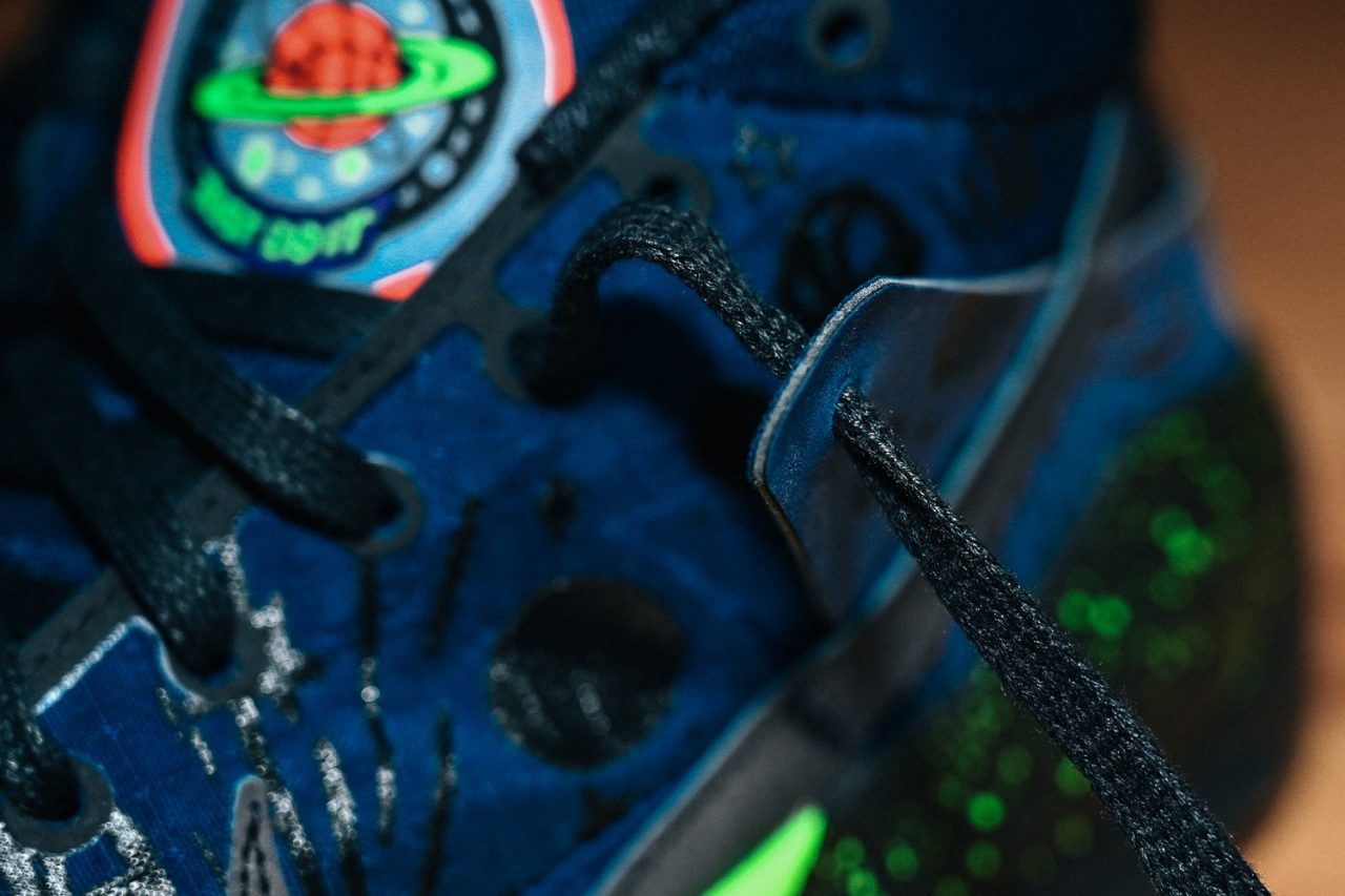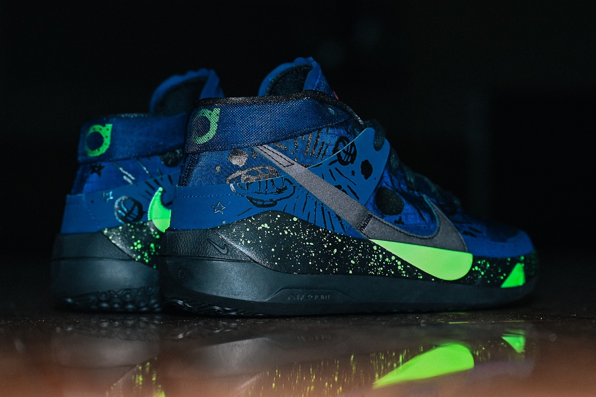 每年三四月無論美國或我們身處的臺灣都是學生聯賽進入白熱化時期,’Planet of Hoops’ 便是以青少年學生籃球為發想的系列作,除了 KD13 還有 Kyrie 6、Adapt BB 2.0、Air Flight 89、Blazer Kickdown 也都被賦予主題意象,Nike 擘畫出一顆籃球星球,配色基調宛如深夜天色,滿載太空科幻氛圍在我看來就像每位球員競逐籃球夢的過程,眼前這景象遙遠但又真實無比;其實不只學生球員,以球為業的頂尖好手們又何嘗不是如此?Kevin Durant 從在家鄉 Seat Pleasant 體育館附近的坡道折返跑看日出 (因為天沒亮就開始訓練了) 一步步淬鍊出叱吒最高殿堂的技術,而遭受阿基里斯腱傷勢之後依然獲得頂薪合約待遇,說明了球隊對他能克服傷痛重回頂尖身手所抱持的信心,另一方面 Nike 設計團隊也用全腳掌 Zoom Air + 前掌 Zoom Air 如此強調啟動反應的配備打造好 KD13,陪伴他再闖籃球之星的顛峰。
