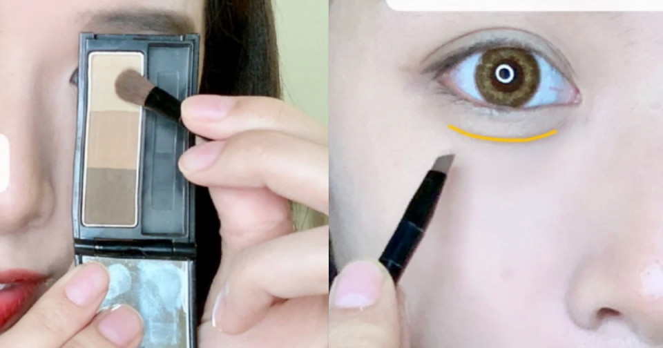 STEP 1:淡咖啡色眼線筆、液態眉筆描繪臥蠶陰影