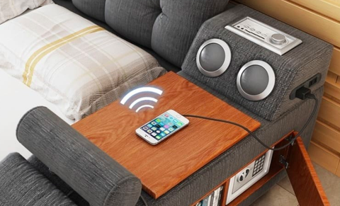 雙喇叭立體藍芽音響就鑲嵌在床組裡,多功能面板超便利,躺在床上隨手操作,整個床就是環繞劇院,在床上就可以享受音樂。