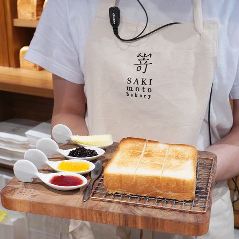 店鋪內提供內用的果醬吐司套餐供消費者細細品嚐,以木盤端盛上桌,烘烤出爐有9宮格印記的道地日式生吐司,自由選擇3款由 嵜 SAKImoto Bakery 特製研發的果醬,用白色小湯匙盛裝,精巧可愛,最後再以濃郁絲滑的北海道奶油或法國奶油點綴,不論是單吃吐司的原味,或是塗抹奶油與果醬,超過千種以上的搭配組合,創造專屬於你的美味。