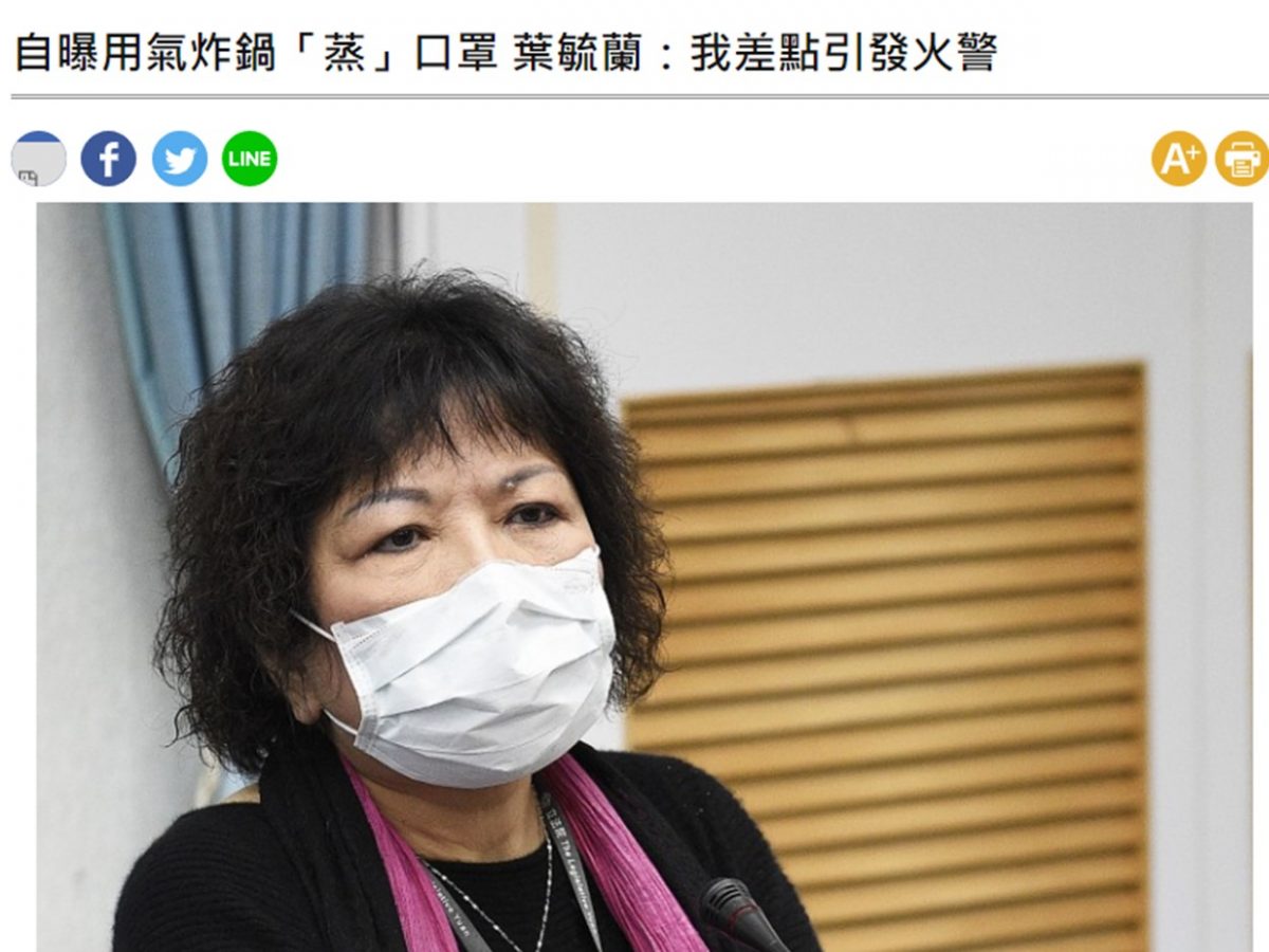 由於武漢肺炎(新冠肺炎)持續升溫,戴口罩來防疫已經是全民運動。雖然台灣醫療用口罩每個$5已是全球最低,但每天消耗一個醫療用口罩對於受疫情影響的甘苦人而言,也是一個不小開銷。為減少口罩耗用,經學者與疾管局檢驗證實,「電鍋乾蒸法」使用可使口罩復活,但重複乾蒸使用5次後,過濾效力減損就需丟棄。不過,國民黨葉毓蘭立委日前在立法院內政委員會質詢內政部長徐國勇時,自曝她因為沒有電鍋,昨天只好嘗試用氣炸鍋來「蒸口罩」,沒想到差點在立法院青島二館引發火警。