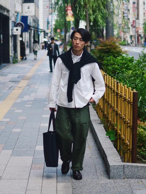 襯衫一直以來都是上班族穿搭的必備單品,不過襯衫有時還是會給人一股正式木訥的印象,當想為造型注入幾分率性氣息的話,可以利用包包做為連結加入黑色帆布購物袋,瞬間讓整體看起來顯得都會又時髦。