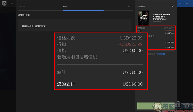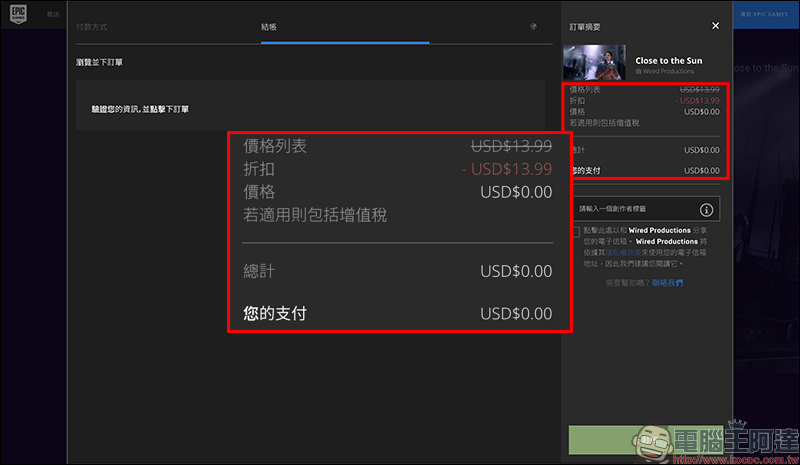 以《Close To The Sun 靠近太陽》為例,原價要 23.99 美金(約合新台幣 721 元),在訂單頁面顯示折扣後直接變成免費,只要確認金額為免費且確定要下載,接著按下右下角「下訂單」按鈕即可透過 EPIC Games 啟動器安裝遊戲:
