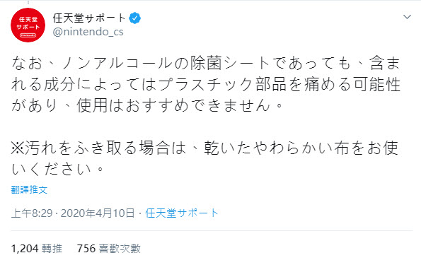 任天堂也進一步說明,酒精等溶劑很有可能會讓Nintendo Switch 及控制器 Joy的塑膠部分脫色甚至變形;至於非酒精的除菌布或紙巾,任天堂也表示,裡面含有的成分仍可能對塑膠部分產生影響,因此也不建議使用,最好就是照安全使用須知中提到的「髒污時,請用柔軟的乾布擦拭,切勿使用稀釋劑、揮發油、酒精等溶劑。」