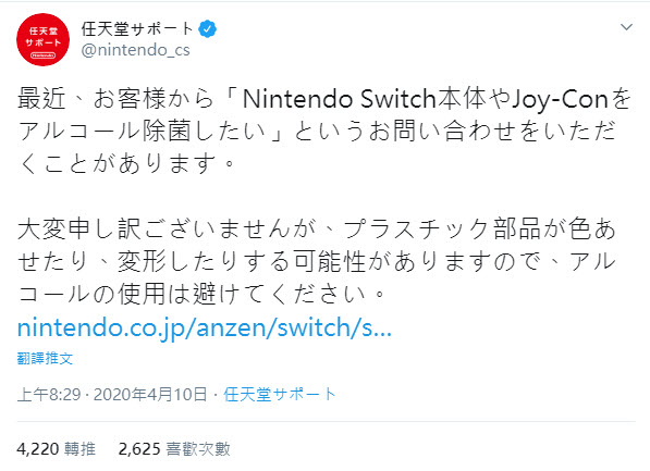 隨著嚴重特殊傳染性肺炎(又稱COVID-19,武漢肺炎)疫情擴散之故,越來越多人在家隔離做的事之一就是玩遊戲,不過像是Nintendo Switch這類家用主機的控制器被長時間使用,越來越多人玩遊戲的同時,也開始在想該如何清潔這類周邊以做好防疫工作,因此當收到許多人詢問「能否使用酒精消毒Nintendo Switch與Joy-Con控制器?」時,任天堂也就此做出官方回應。