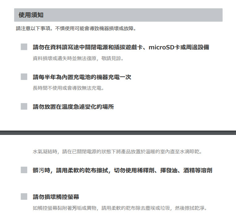 那麼任天堂又是如何回應「能否使用酒精消毒Nintendo Switch與Joy-Con控制器?」的提問,其實答案跟Apple產品的通用原則類似:「僅使用柔軟不起毛絮的乾布擦拭髒污,切勿使用稀釋劑、揮發油、酒精等溶劑。」任天堂首先提供Nintendo Switch的安全使用須知,裡面其實提到:「髒污時,請用柔軟的乾布擦拭,切勿使用稀釋劑、揮發油、酒精等溶劑;如觸控螢幕黏附著污垢或異物,請用柔軟的乾布除去塵埃或垃圾,然後擦拭乾淨。」