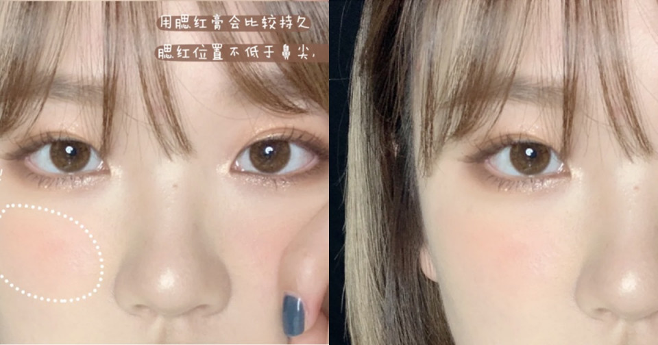 空氣感妝容選擇的腮紅顏色通常偏向蜜桃色、裸粉色,上臉後看起來會更加輕盈、有活力~而腮紅的位置則建議在顴骨旁的眼睛下方、呈圓形狀,且位置不低於鼻尖!這樣會很有減靈感,又可以修飾臉頰肉,也讓臉部更有氣色!