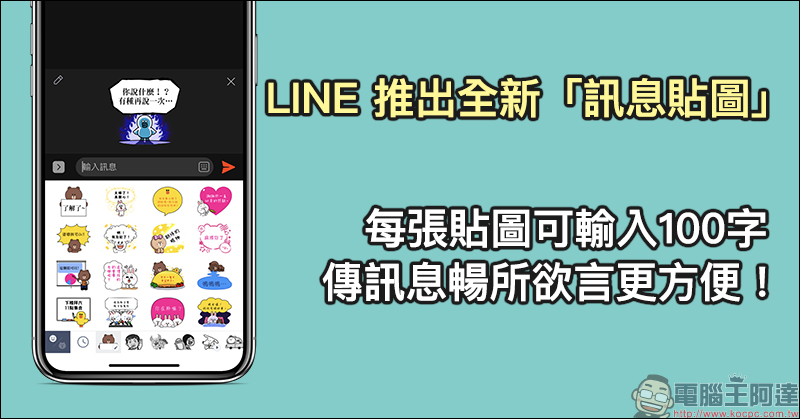LINE 推出全新「訊息貼圖」,每張貼圖可輸入100字,傳訊息暢所欲言更方便!