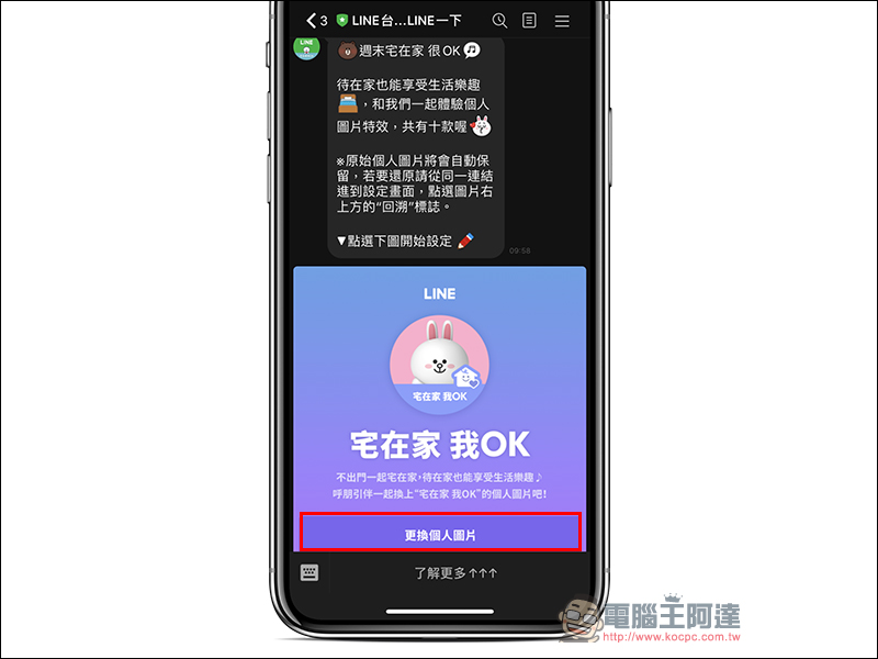 LINE 台灣今(11)日也推出「宅在家 我OK」的個人圖片特效,若先前已將「LINE台灣–再LINE一下」官方帳號(點我加好友)加為好友的的 LINE 用戶,可直接在聊天室點選圖片連結快速前往設定頁面。
