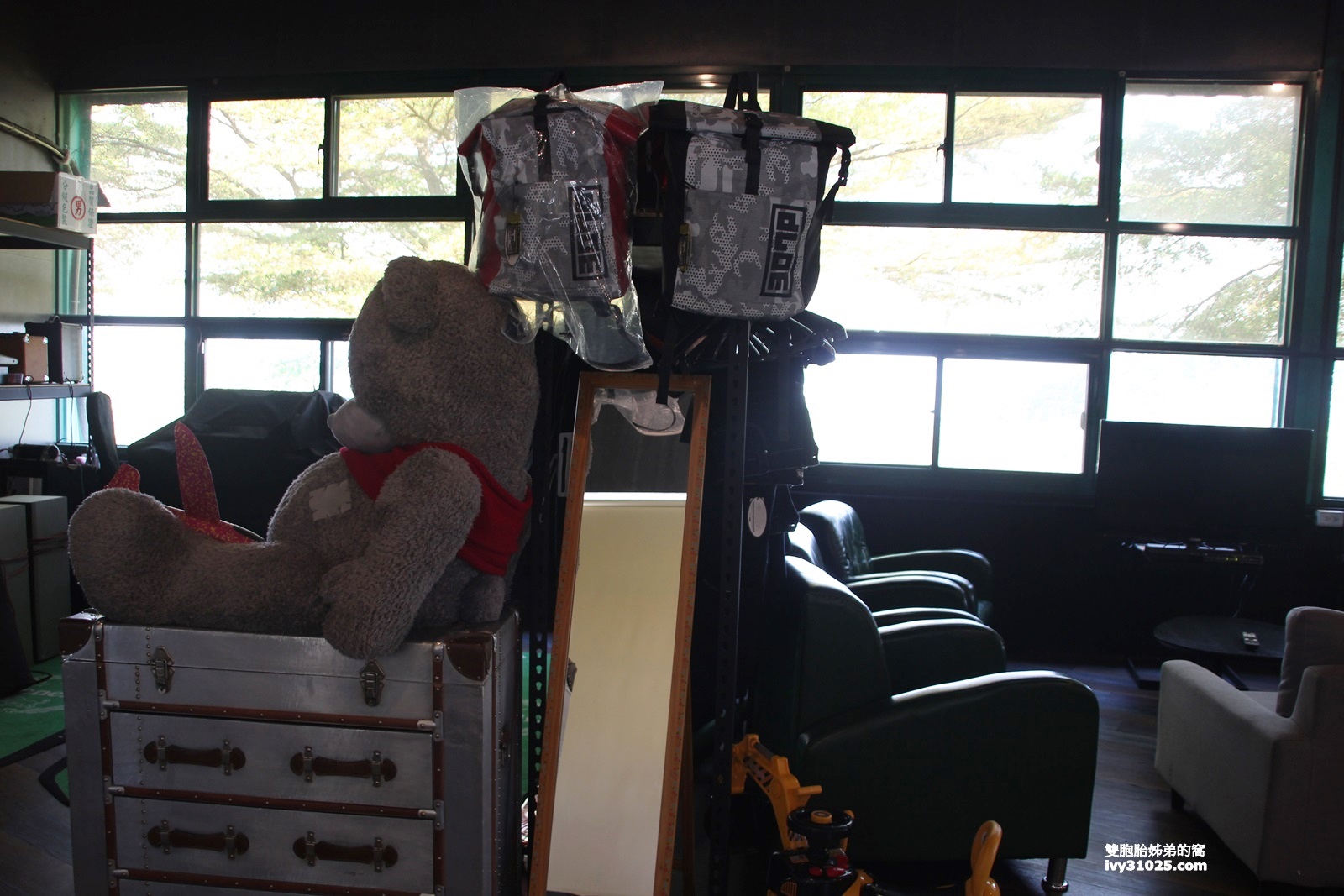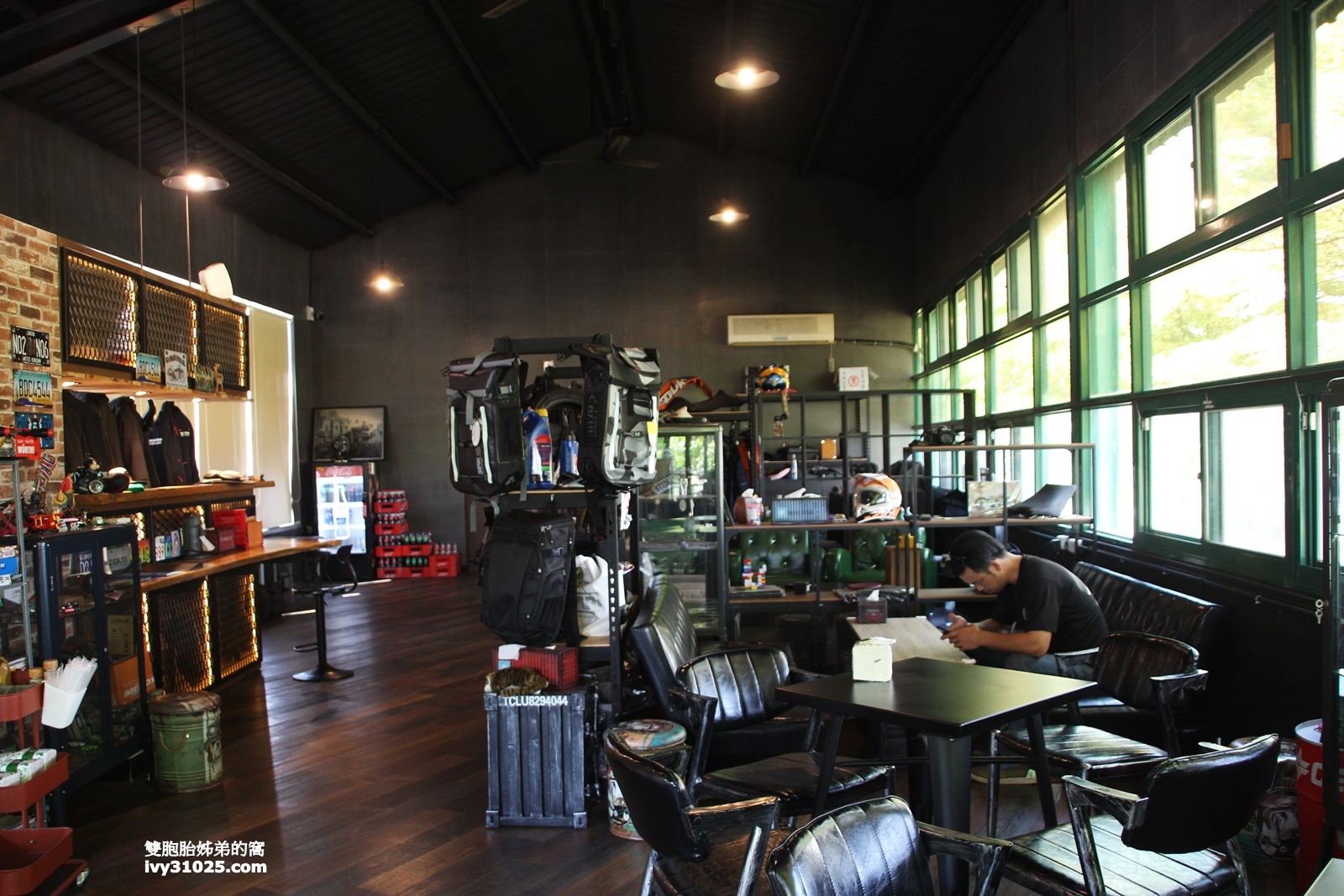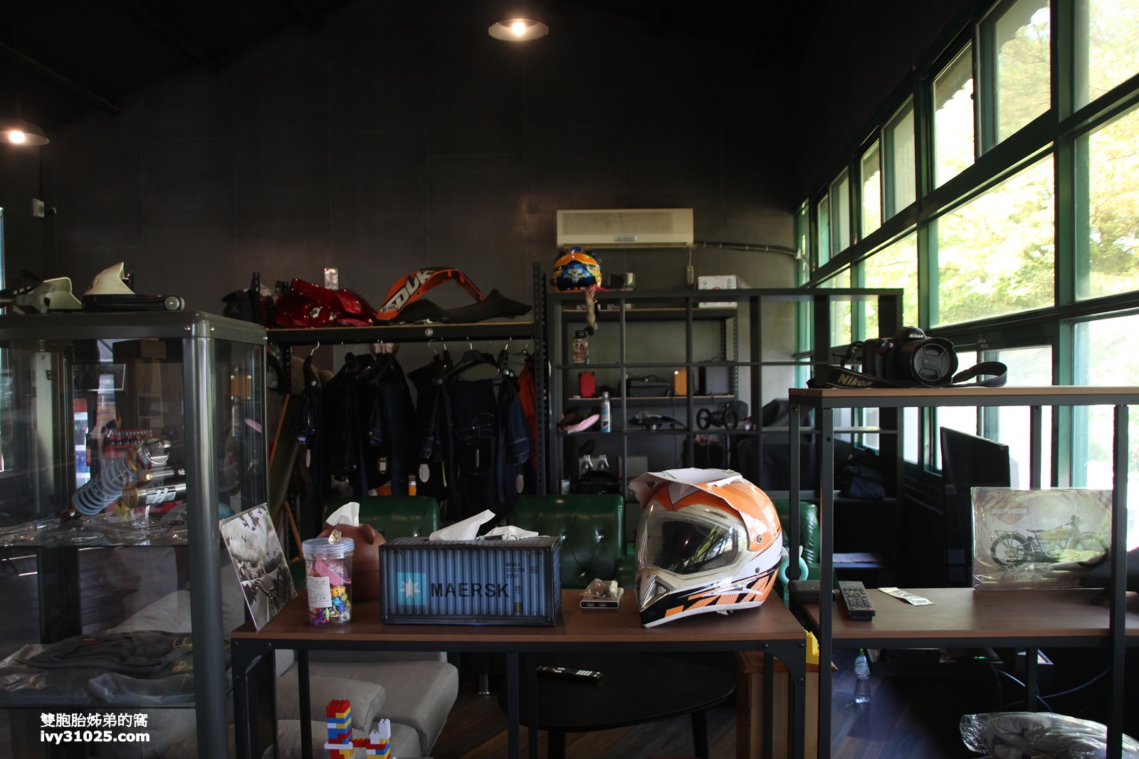 走進Rider’s Hall 騎士殿室內餐廳,可以看到裡面擺滿很多重型機車騎士需要的安全帽/背包/衣服,還有復古的餐桌椅。