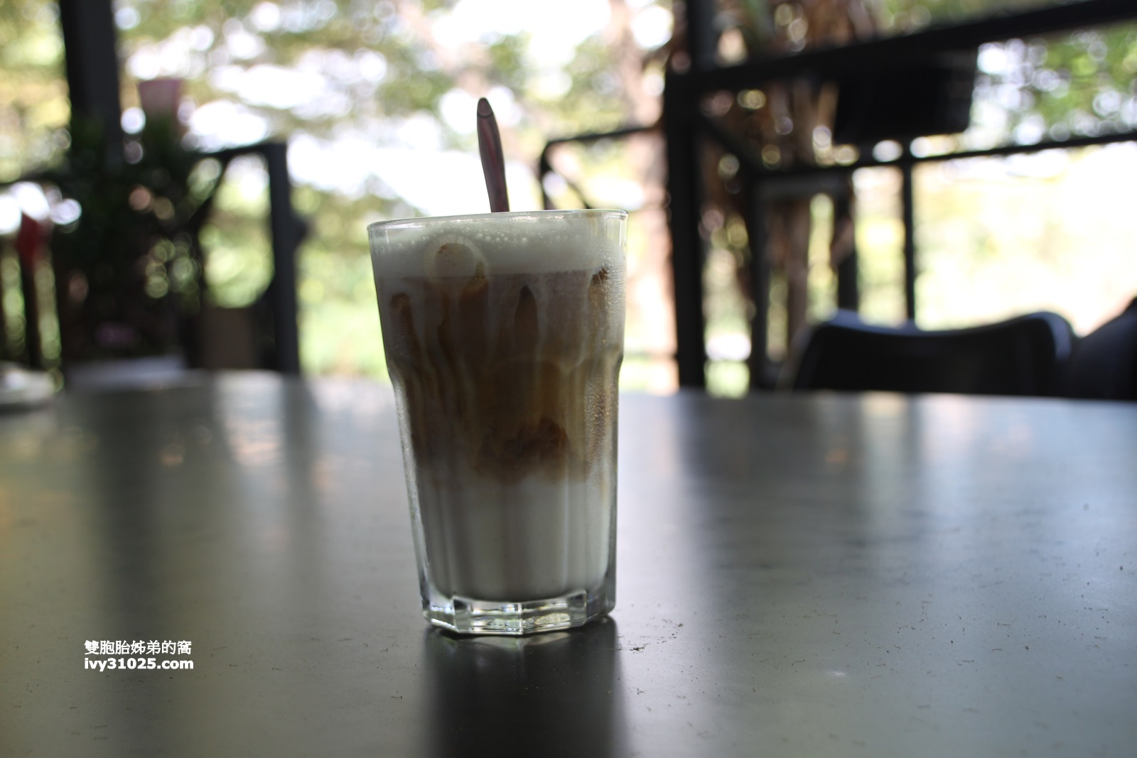 我點了一杯拿鐵咖啡坐在外面乘涼。