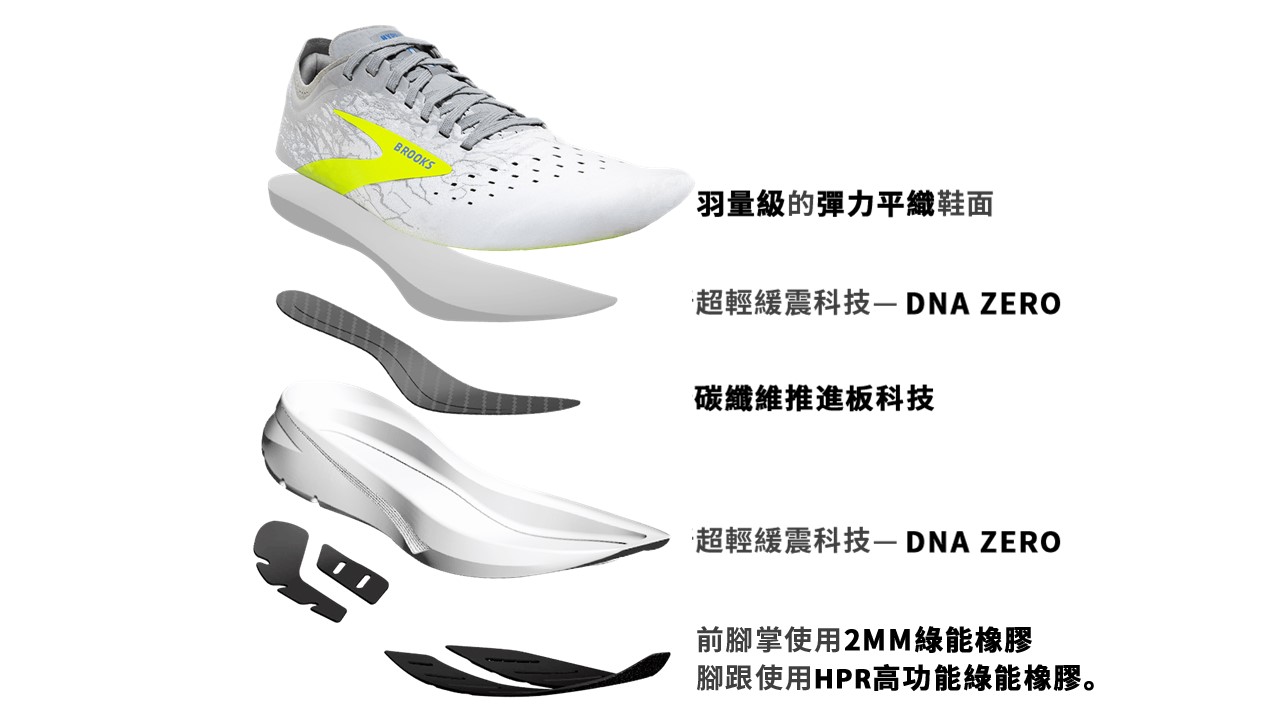 BROOKS Hyperion Elite 全新升級,具有輕巧的彈力平織鞋面,以及 BROOKS 全新的 DNA ZERO 中底科技和市場最夯、最廣為人知的碳纖維推進板。
