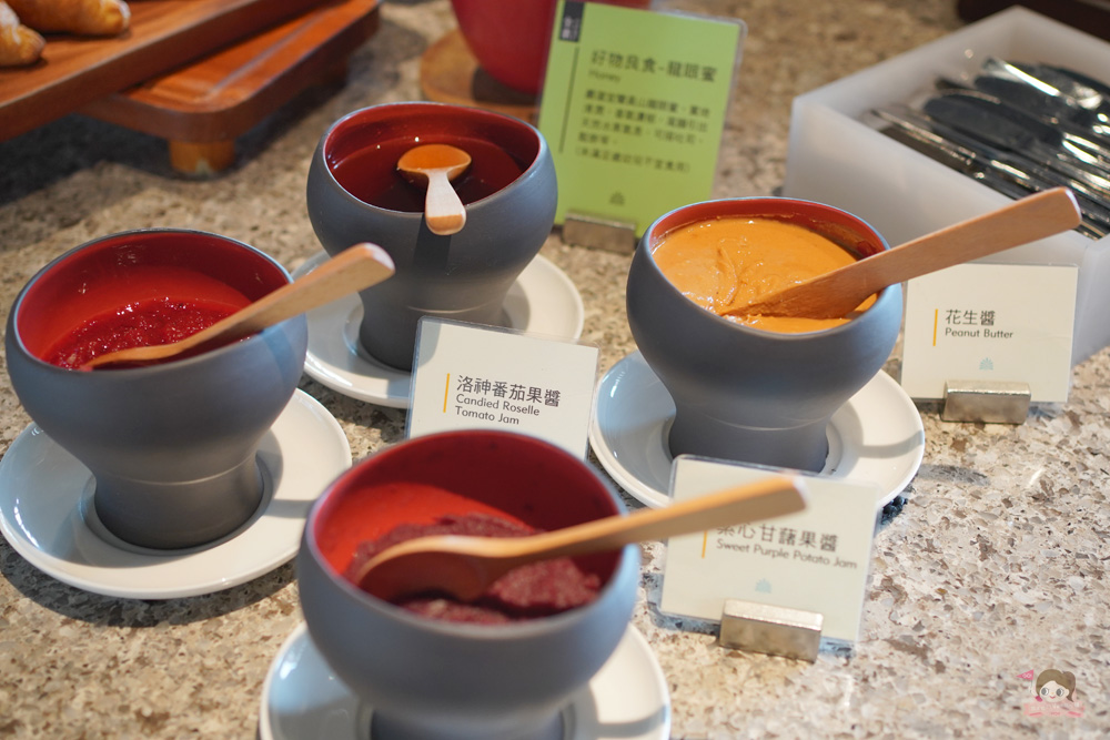 麵包抹醬不馬虎,洛神番茄、紫心甘藷果醬,別具台灣本土特色,香醇濃郁搭配歐式麵包很對味
