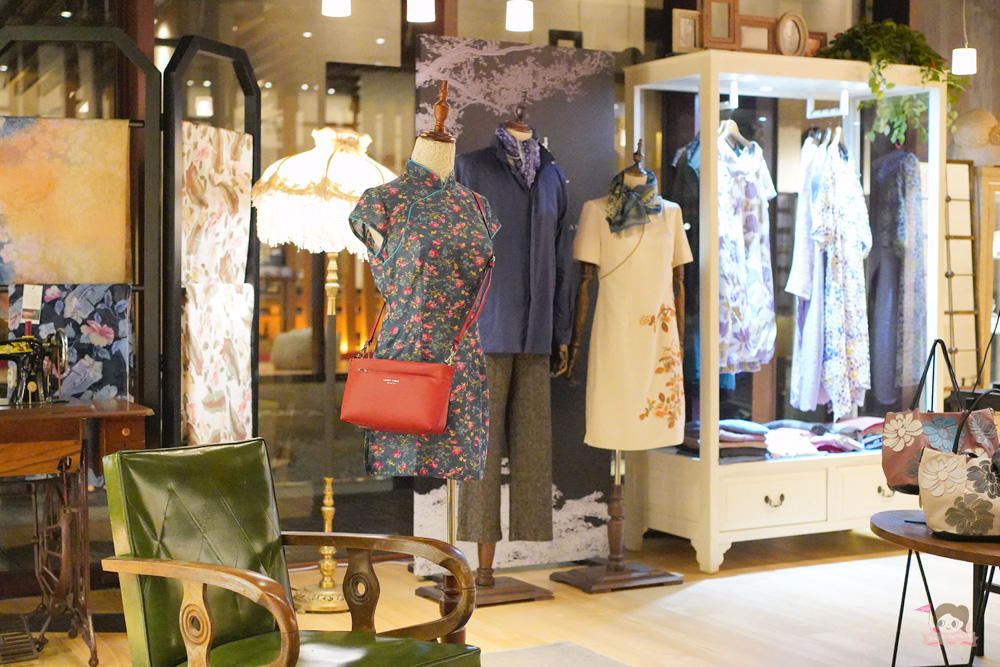 藝品店裡有宜蘭在地伴手禮、SPA 保養品、奇石木雕,充滿台灣復古風情的手工旗袍、唐裝、包包