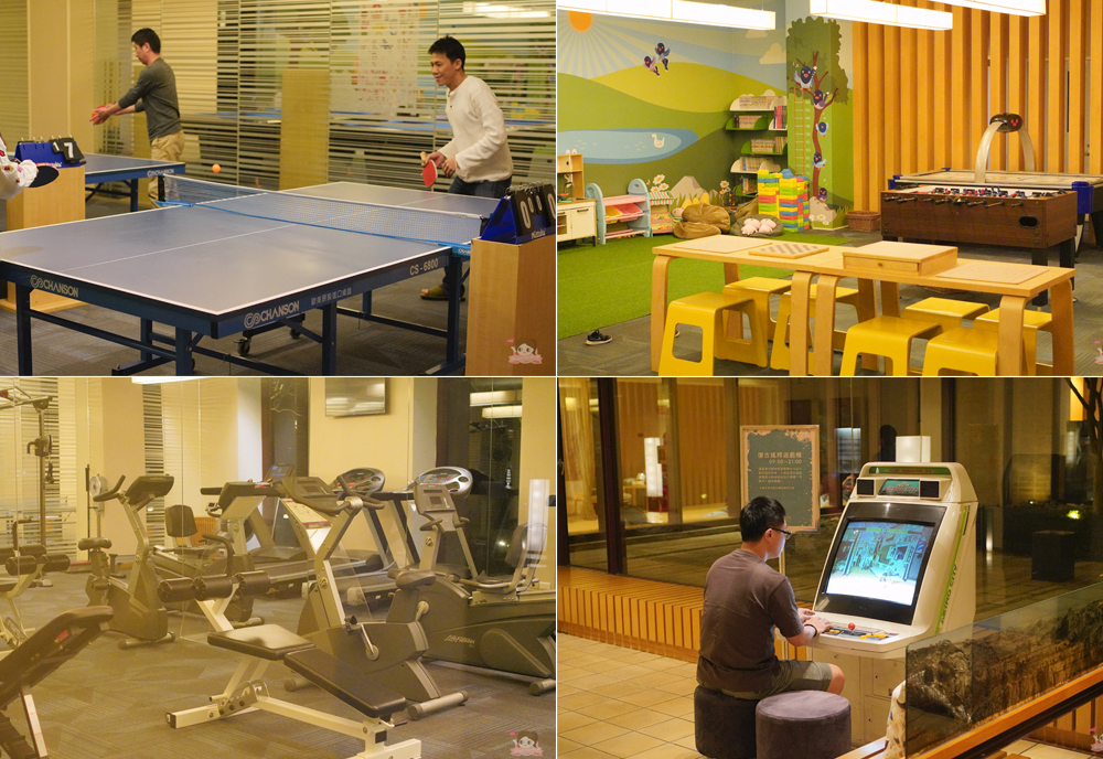 室內的休閒娛樂有健身房、桌球室、兒童遊戲室,還有一台吸引超多人的大型遊戲機台,只要向工作人員兌換代幣就可遊玩
