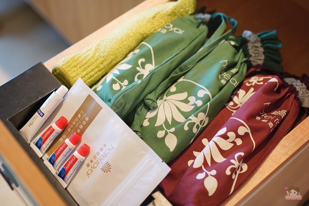 以日式浴衣取代浴袍,非回收式的夾腳托鞋,觸感很不錯、好穿;另外衣櫃裡提供風呂提袋,去泡湯時可以裝上個人物品