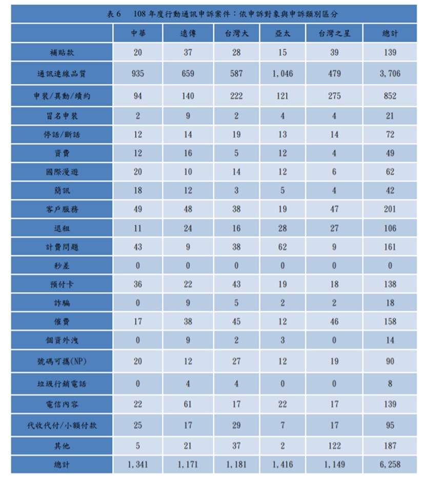 就佔申訴總數87.3%的行動通訊類申訴案件來看,依申訴對象進行分析,2019年各電信業者中,以亞太電信案件數最多(共1,416 件、占 22.63%),其次為中華電信(共 1,341 件、占 21.43%)、台灣大哥大(共 1,181 件、占 18.87%)。