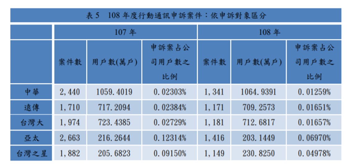 如與 107 年度行動通訊申訴案件數占百萬客戶數比進行比較,每百萬客戶數申訴量以亞太電信減少最多 534.3 件,其次為台灣之星417.2 件。