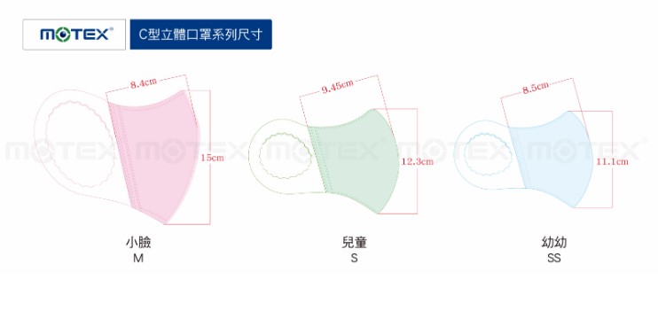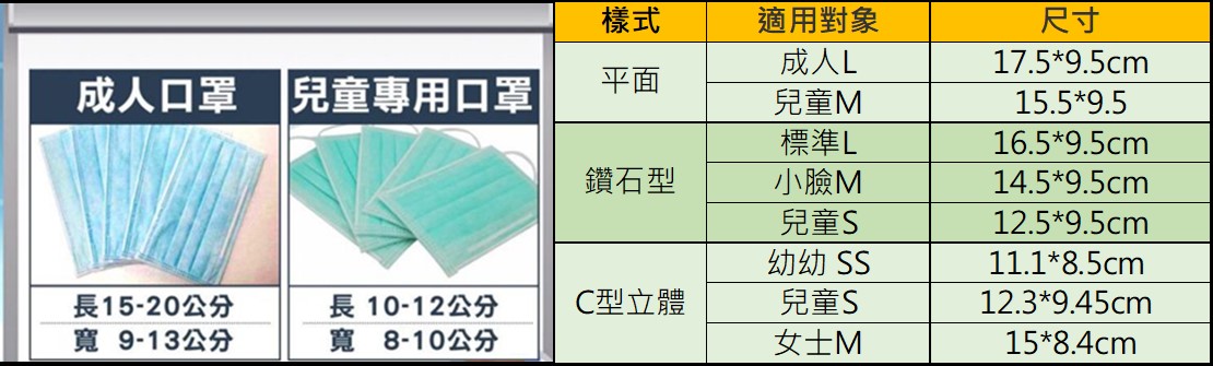 口罩依樣式一般平面型、鑽石型及C型口罩,平面型、鑽石型等品項之尺寸皆為S/M/L; C型口罩之尺寸則分為L(大人)、小臉(M)、兒童( S)及幼幼(SS)。