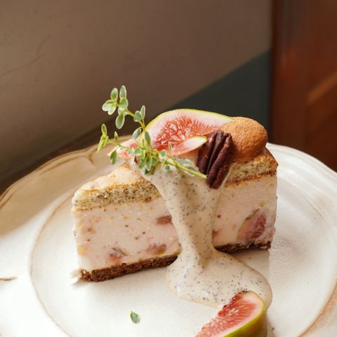 無花果生起司蛋糕體加入無花果汁、可爾必思,讓生起司的風味更酸甜、清爽,上下層分別搭配疍宅自製的伯爵茶蛋糕與餅乾,讓滑順的起司口感更有層次感。