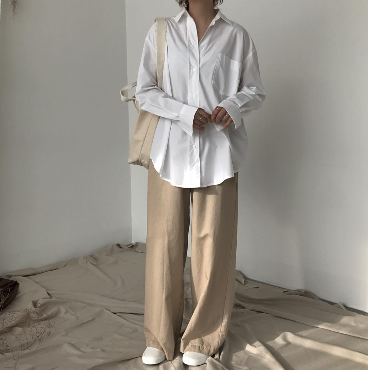 這是屬於比較日系的穿法,像是在辦公室上班的小資女,必須穿著襯衫工作的話,就可以試著將本來習慣穿的緊身、太挺的白襯衫改成寬鬆柔軟材質的垂墜感襯衫,搭配一件高腰寬版的褲子,一樣表現俐落專業,卻能穿出隨性的自然感!