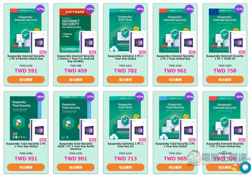 卡巴斯基系列也提供不少選擇,另外要注意是,購買時請找名稱後面有寫 GLOBAL(全球),這在台灣才能啟用,如果是特定區域如:EU、North America 就不行: