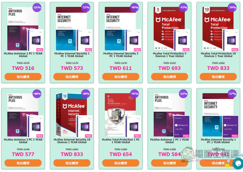 除了 McAfee Antivirus,其他 McAfee 系列的防毒軟體價格也都很優惠,右上第一、二個的 McAfee Total Protection 還提供 5 台或 10 台裝置 1 年序號選項,家裡有多台電腦的人很值得考慮,要不然就是跟朋友合資,如果你可以找到 10 個人,那 1 台 1 年最低只需要 83 元台幣,少喝一杯咖啡就能獲得一整年的電腦保護,更別提你還偷偷拿到一組 Windows 10 Pro 序號: